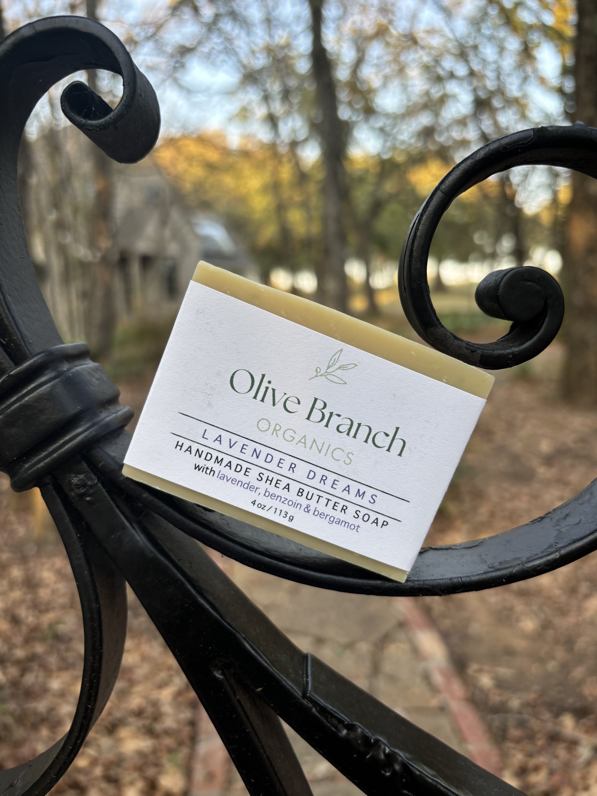 - Lavender Dreams - Saponified Organic Olive Oil, Organic Flaxseed Oil, Organic Coconut Oil, Organic Shea Butter, Essential Oils (Lavender, Benzoin, Bergamot), Organic Comfrey Leaf